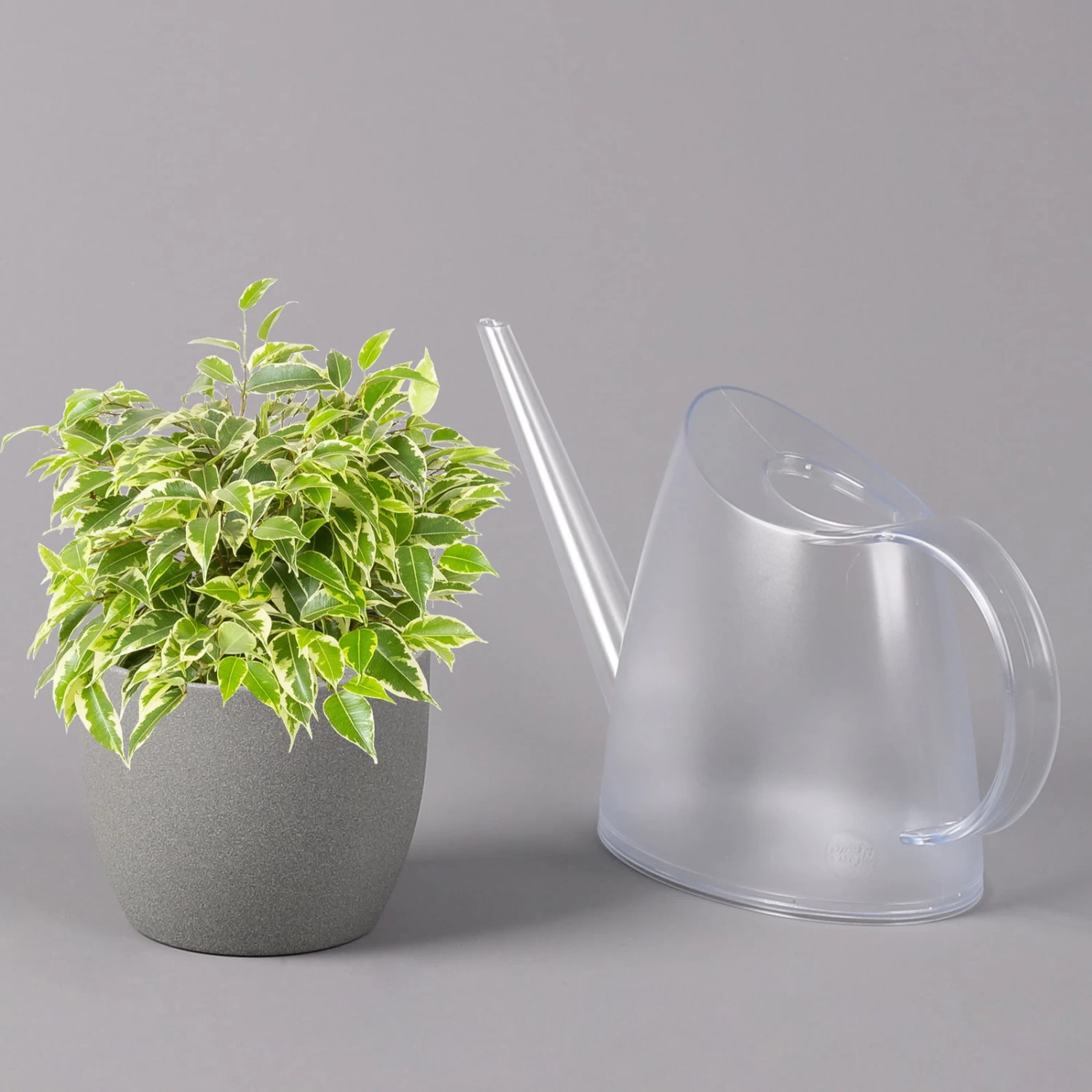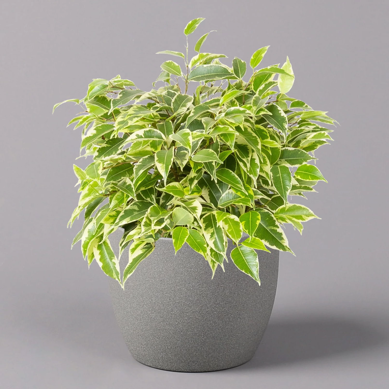 Die Birkenfeige (Ficus benjamina), bei uns auch unter den Namen ‚Benjamini‘ oder einfach nur ‚Ficus‘ bekannt, ist eine klassische Grünpflanze für Zimmer und Büro, die sich seit vielen Jahren großer Beliebtheit erfreut. Charakteristisch sind die elliptischen, zugespitzten Blätter, die je nach Art rein grün oder mit weißer bis gelber Panaschierung versehen sind. Die glänzenden, glatten Blätter sitzen an auffallend dünnen Zweigen, die an den Spitzen leicht überhängen. Die Sorte ‚Kinky‘ kann bei guter Pflege bis zu knapp 1 Meter hoch werden.