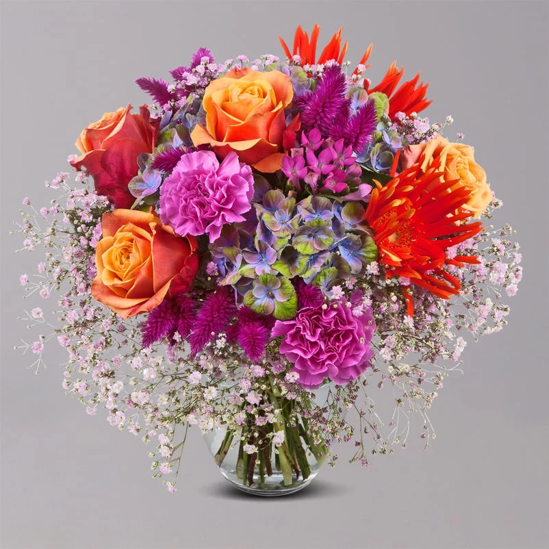 Fünf orange-rote Rosen sorgen in Verbindung mit zwei orangefarbenen Germini für eine farbenfrohe Blütenexplosion, die von drei pinkfarbenen Celosien und zwei pinkfarbenen Nelken auf einzigartige Weise unterstrichen wird. Eine blau-grüne Hortensie sowie eine pinkfarbene Bouvardie runden das farbstarke Blütenspektakel harmonisch ab. Umrahmt wird die exklusive Floristikkomposition von zartrosafarbenem, luftigem Schleierkraut, das für das Sahnehäubchen auf der knalligen Kreation sorgt.