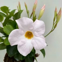 Die großen Blüten sind trichterförmig ausgebildet und begeistern in der Farbe Weiß. Von Mai bis Oktober setzt die Dipladenie schöne Akzente in Ihrem Zuhause.