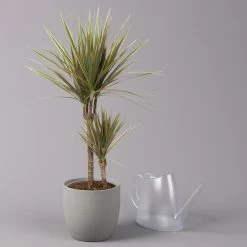 Die Dracaena marginata ‚Bicolor‘ setzt farbenfrohe Akzente und begeistert mit einer verspielten Mischung aus roten Streifen und festlichen Weiß. Die optisch attraktive Pflanze vermag außerdem mit einer weiteren Eigenschaft zu punkten: Die Drachenbäume entziehen nämlich der Raumluft mehrere giftige Substanzen, darunter Benzole und Formaldehyde. Da diese Verbindungen nicht zuletzt von modernen elektronischen Geräten emittiert werden, ist die Dracaena marginata ‚Bicolor‘ zur Begrünung von einem Home-Office bestens geeignet. Suchen Sie für Ihren Drachenbaum einen hellen Platz ohne direkte Sonneneinstrahlung aus und seien Sie sparsam beim Gießen. Das subtropische Gewächs mag es warm.