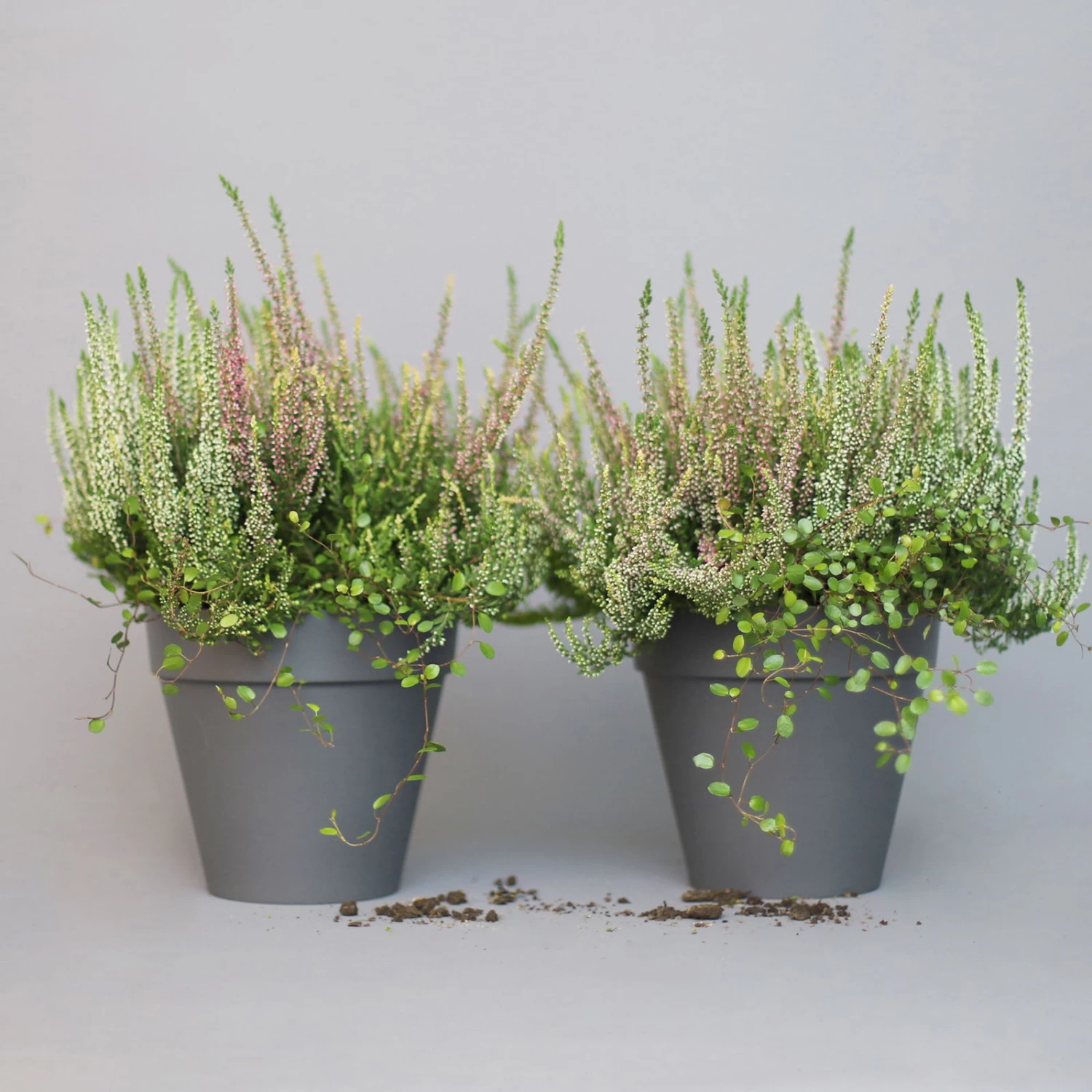 Der Mix aus Knospenheide (Calluna vulgaris), Mühlenbeckia (Mühlenbeckia axillaris) und Baumheide (Erica arborea) bilden mit ihren unterschiedlich aussehenden Blättern eine abwechslungsreiche und herbstliche Einheit. Die Blätter der Mühlenbeckia sind rund, glatt und sattgrün und wachsen an drahtigen, kriechenden Zweigen. Die der Baumheide sind nadelartig und die Blätter der Calluna liegen schuppenförmig am Zweig an. Das gepflanzte Trio wächst buschig und aufrecht, abgesehen von der Mühlenbeckia, die mit leicht überhängendem Wuchs über Töpfe rankt. Die Baumheide ist die größte Pflanze in diesem Heidepflanzen Mix und kann eine Wuchshöhe von bis zu 100 cm erreichen und auch bis zu 60 cm breit werden.