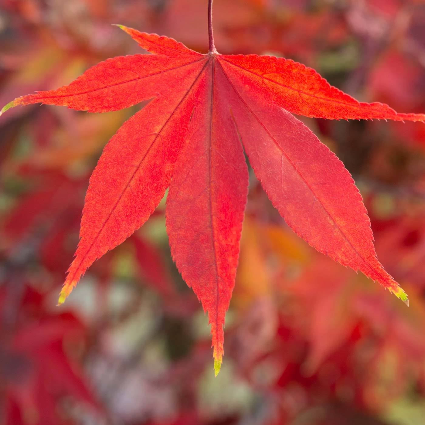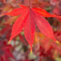 Der japanische Fächerahorn Acer palmatum ‚Osakazuki‘ ist ein 400 bis 600 Zentimetern hoher dekorativer und pflegeleichter Strauch oder Kleinbaum. Seine großen, fächerförmigen Blätter, die im Sommer kräftig grün leuchten, begeistern mit einer prachtvollen Herbstfärbung in leuchtendem Orange und Karminrot. Für außerergewöhnliche Akzente sorgen effektvolle Blütenstände und Früchte in Rot. Am besten eignet sich der Fächerahorn ‚Osakazuki‘ zur Verwendung als Solitärpflanze oder in kleinen Gruppen. Nicht zuletzt harmoniert der Acer palmatum mit fernöstlich angehauchten Gartenkonzepten. Suchen Sie für Ihren japanischen Fächerahorn einen sonnigen bis halbschattigen Standort aus, damit seine Blattfärbung gut zur Geltung kommt. Toll wirkt der Acer ‚Osakazuki‘ auch in Gruppen mit rotlaubigen Ahornsorten. Durchlässige, humose Gartenböden ohne Staunässe sind für den Acer ‚Osakazuki‘ genau richtig. Während der Trockenheit ist der Strauch regelmäßig zu gießen.