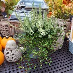 Das Duo Knospenheide (Calluna vulgaris) und Mühlenbeckia (Mühlenbeckia axillaris) begeistert mit einer interessanten Kombination aus Blüten und Blattstruktur. Die Blätter der Mühlenbeckia sind rund, glatt und sattgrün und wachsen an drahtigen, kriechenden Zweigen. Die Blätter der Calluna dagegen liegen schuppenförmig am Zweig an. Der Wuchs der Mühlenbeckie ist leicht über Töpfe hängend. Die Knospenheide im Gegenspiel wächst buschig und aufrecht und kann eine Wuchshöhe von bis zu 50 cm erreichen und auch ebenso breit werden.