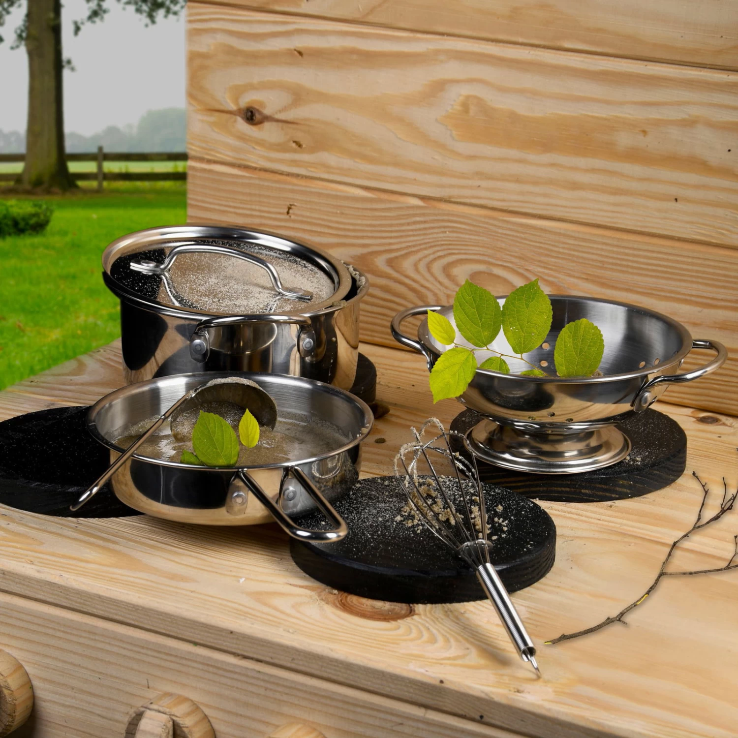 Wenn kochen – dann spielend und natürlich kinderleicht. Dieses liebevoll gestaltete Kochset aus Edelstahl inspiriert die jungen Köche zu erstaunlichen Kreationen. Das fünfteilige Kochset ist unter anderem mit der Outdoor-Kinderküche kompatibel, es ist kindgerecht designt, stabil und leicht zu reinigen.