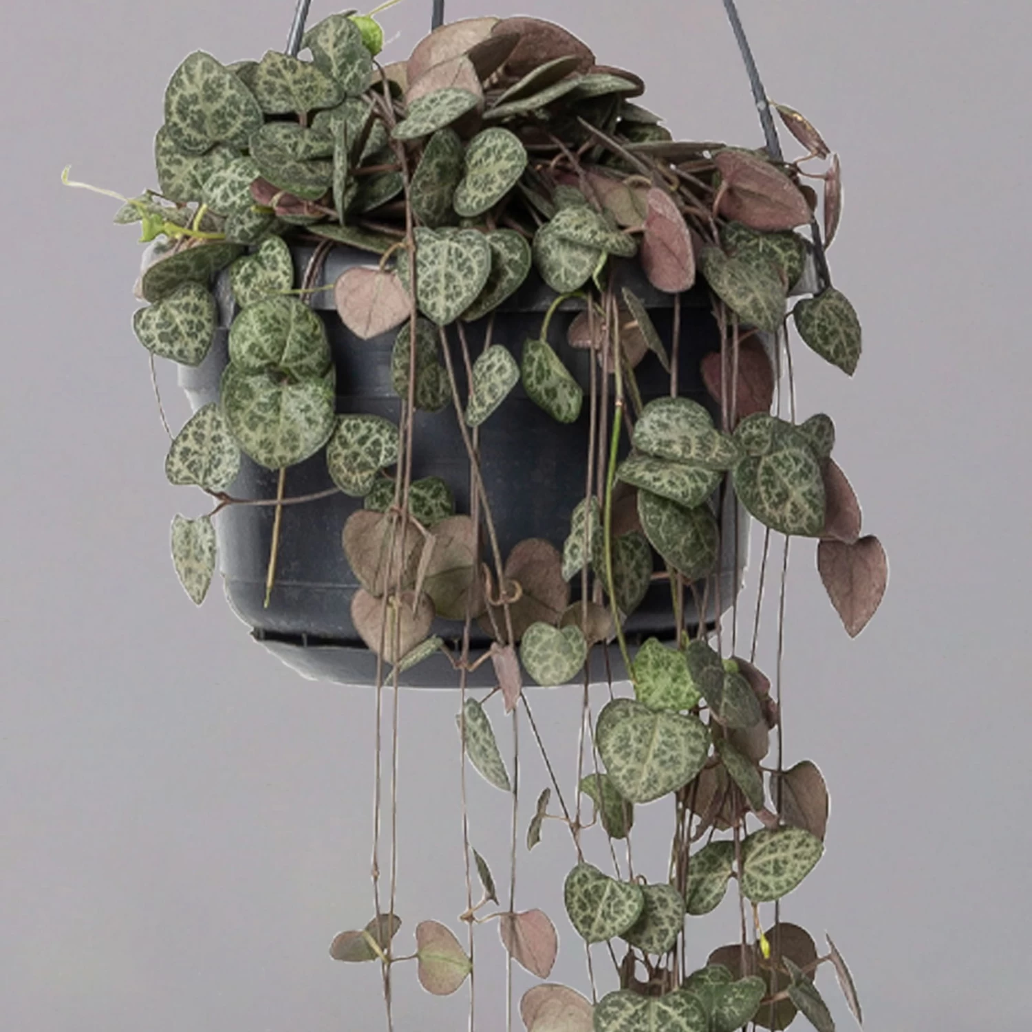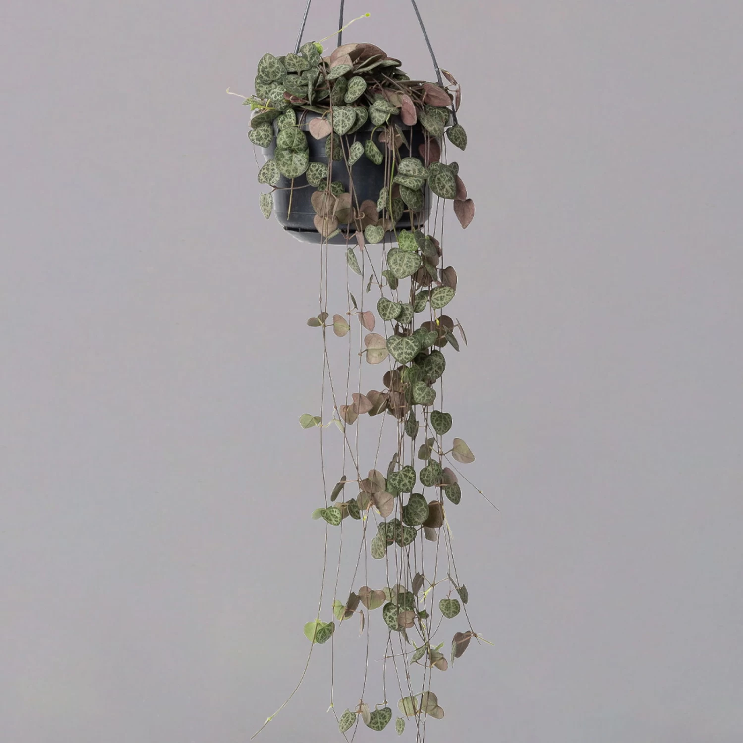Die Leuchterblume (Ceropegia woodii) ist dank ihrer herzförmigen Blätter und der langen, feinen Triebe eine außergewöhnliche Zimmerpflanze. Noch erstaunlicher sind ihre formschönen Blüten in zartem Rosa, die Sie von Spätsommer bis Herbst erleben dürfen. Die Leuchterblume ist eine sukkulente Zimmerpflanze, die nur moderat zu gießen ist und einen hellen Standort ohne direkte Sonne benötigt.