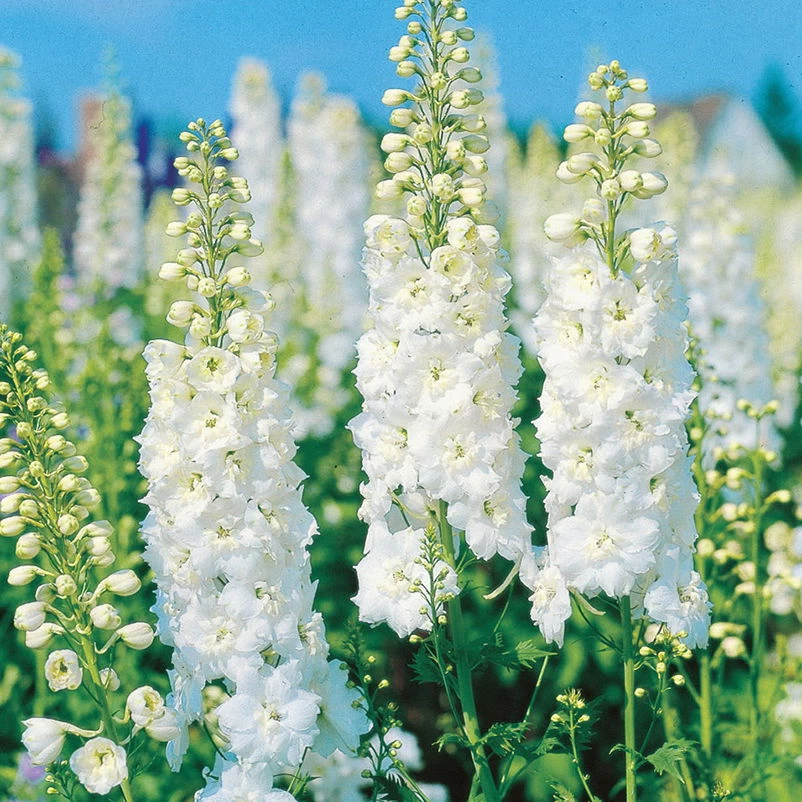 Freuen Sie sich mit dem Rittersporn ‚New Millenium‘ (Delphinium elatum ‚New Millenium‘) auf eine strahlend weiße Blütenpracht von Juni bis September. Der Boden sollte durchlässig und nährstoffreich sein. Mit einer Wuchshöhe von bis zu 180 cm schmückt der frostverträgliche Rittersporn ‚New Millenium‘ nicht nur Ihren Garten, sondern erfreut als Kübelpflanze auch auf dem Balkon oder der Terrasse.