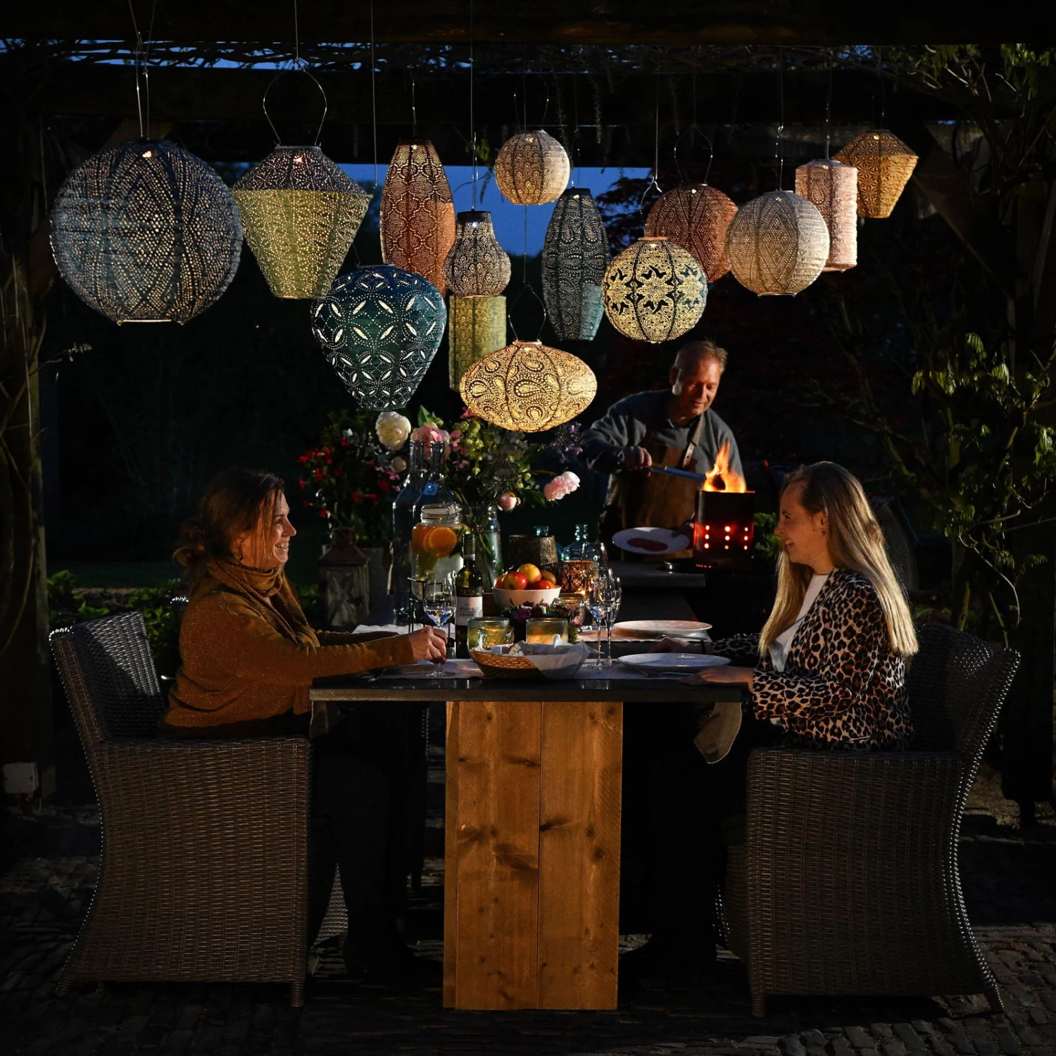 Diese grüne Solarlaterne ‚Round 40 Fiore‘ sieht mit ihrem stylishen Design in jedem Garten gut aus. Sie ist 40 x 38,5 cm groß und zusammenfaltbar. Da sie aus dem robusten Material Tyvek R1443 PU, 43 g/qm besteht, ist sie sehr langlebig. Genießen Sie das stimmungsvolle Ambiente und die schönen Lichtmuster!